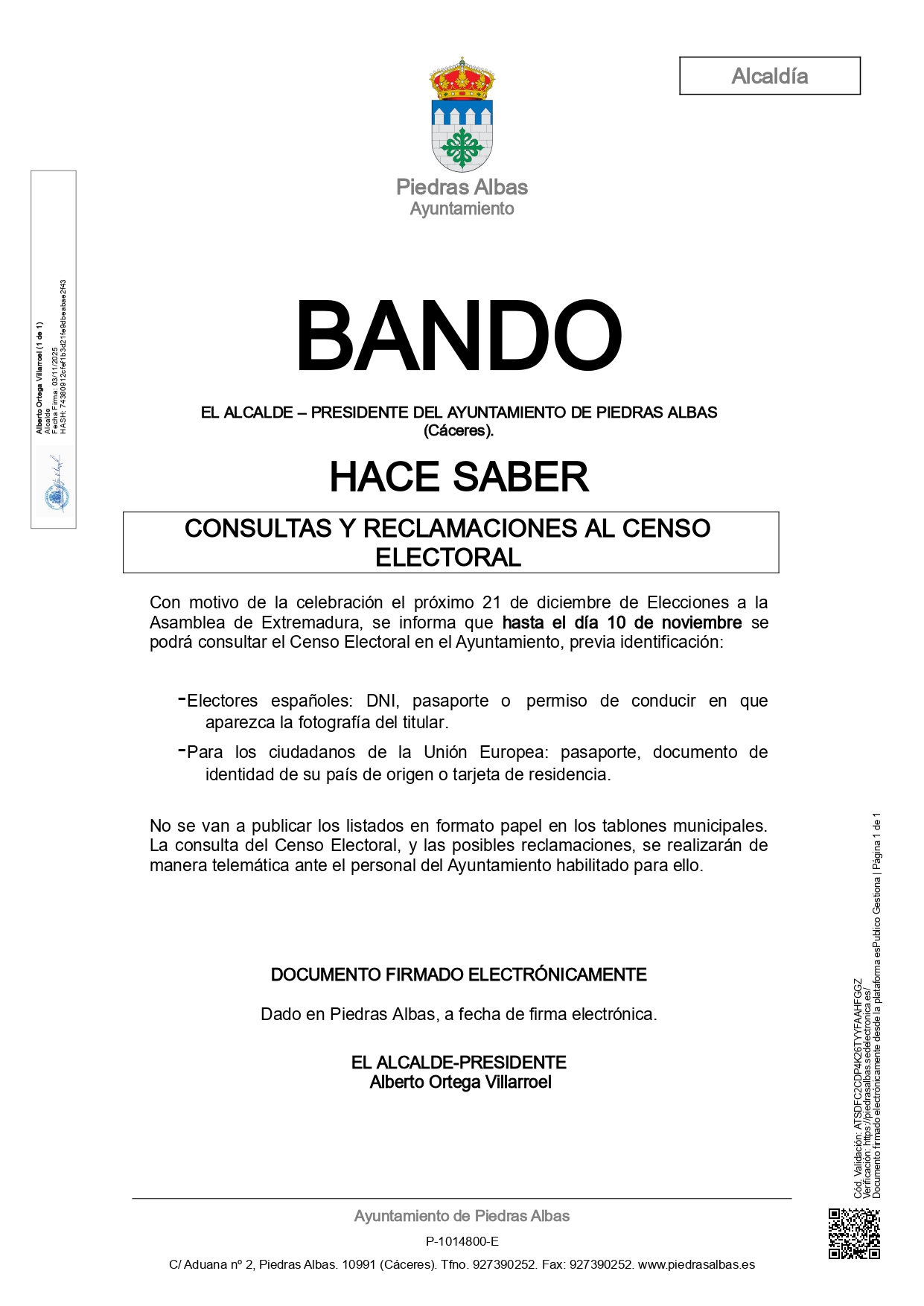 Con motivo de la celebración el próximo 21 de diciembre de Elecciones a la Asamblea de Extremadura, se informa que hasta el día 10 de noviembre se podrá consultar el Censo Electoral en el Ayuntamiento, previa identificación: