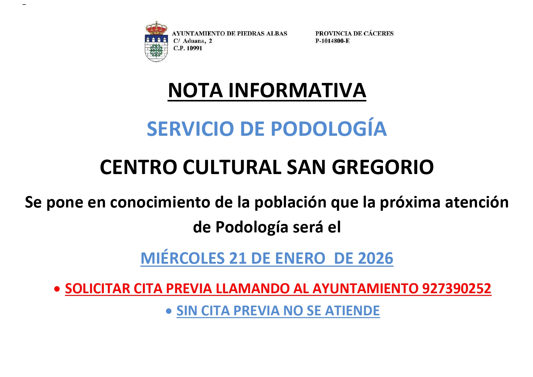 Se informa a la población que la próxima atención de Podología será el miércoles, 21 de enero de 2026 en el Centro Cultural San Gregorio.