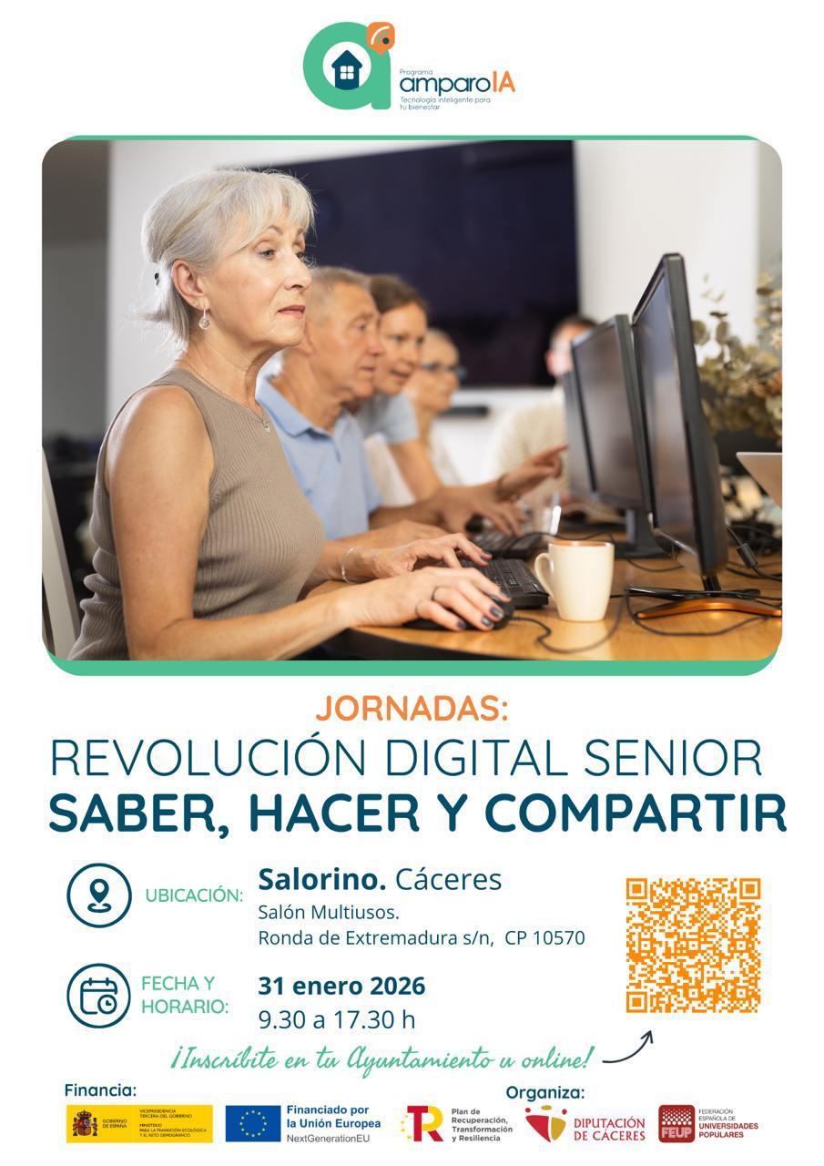 La Diputación Provincial de Cáceres en colaboración con la FEUP organiza, dentro del Programa AMPARO IA – Reto Rural Digital, unas jornadas presenciales pensadas para personas mayores y para quienes quieran mejorar su relación con la tecnología de forma práctica, cercana y segura.