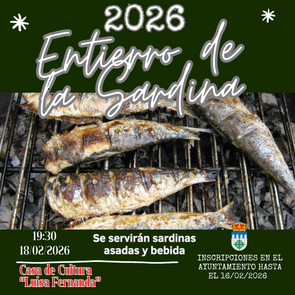 El Miércoles de Ceniza, 18 de febrero de 2026, también a las 19:30 horas y en la Casa de la Cultura "Luisa Fernanda" celebraremos el Entierro de la Sardina y el Ayuntamiento ofrecerá a todas las personas sardinas asadas, pan y bebida. Inscripción en el Ayuntamiento hasta las 14:00 horas del día 16 de febrero de 2026.