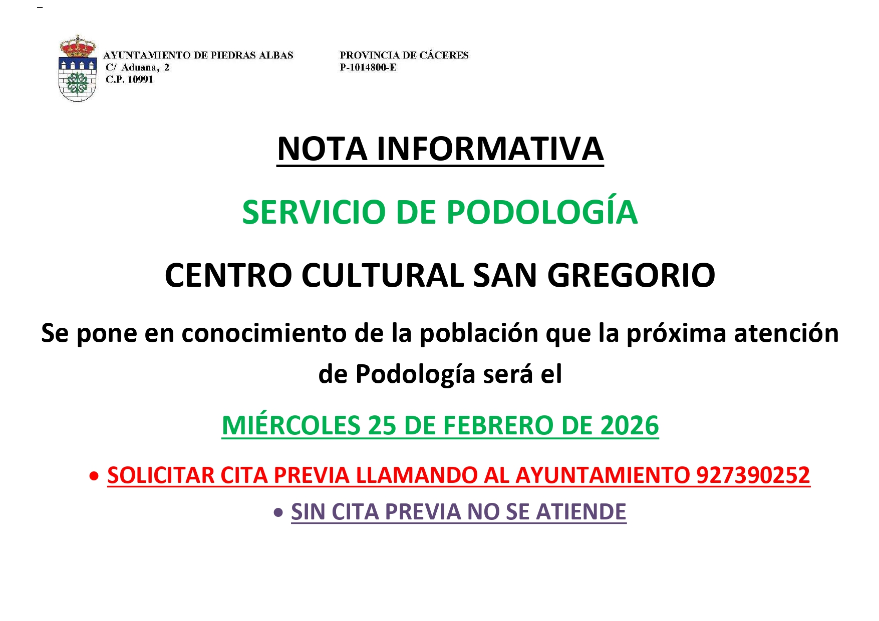 Se informa a la población que la próxima atención de Podología será el miércoles, 25 de febrero de 2026 en el Centro Cultural San Gregorio.